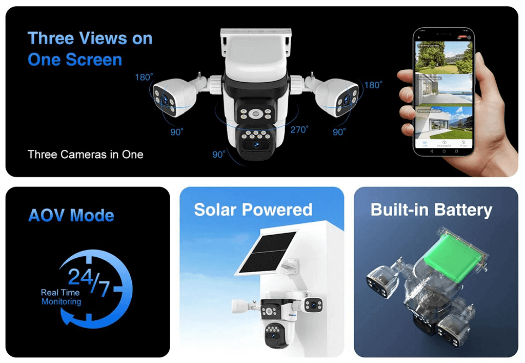 ✅ שלוש מצלמות בו זמנית – צילום פנורמי, מעקב וזוויות רחבות